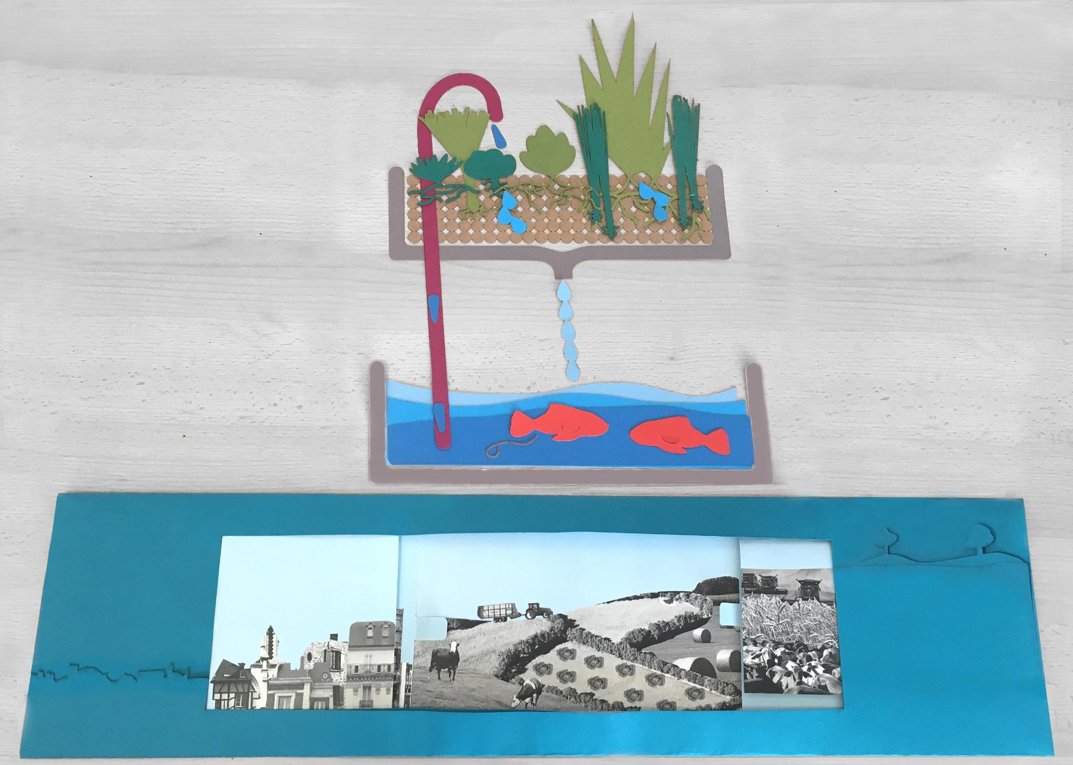 Cet atelier jeune public visait à relier le maraîchage mis en place dans les espaces verts du collège Gérard de Nerval de Créy-en-Valois à un aquarium délaissé du cours de SVT grâce à l’aquaponie. Les différentes séances ont permis à une classe Ulis d’appréhender le cycle de l’eau à travers un puzzle et la réalisation d’un stop motion. Un schéma pop-up leur a quant à lui, présenté les phénomènes d’extension urbaine et de raréfaction des terres arables.