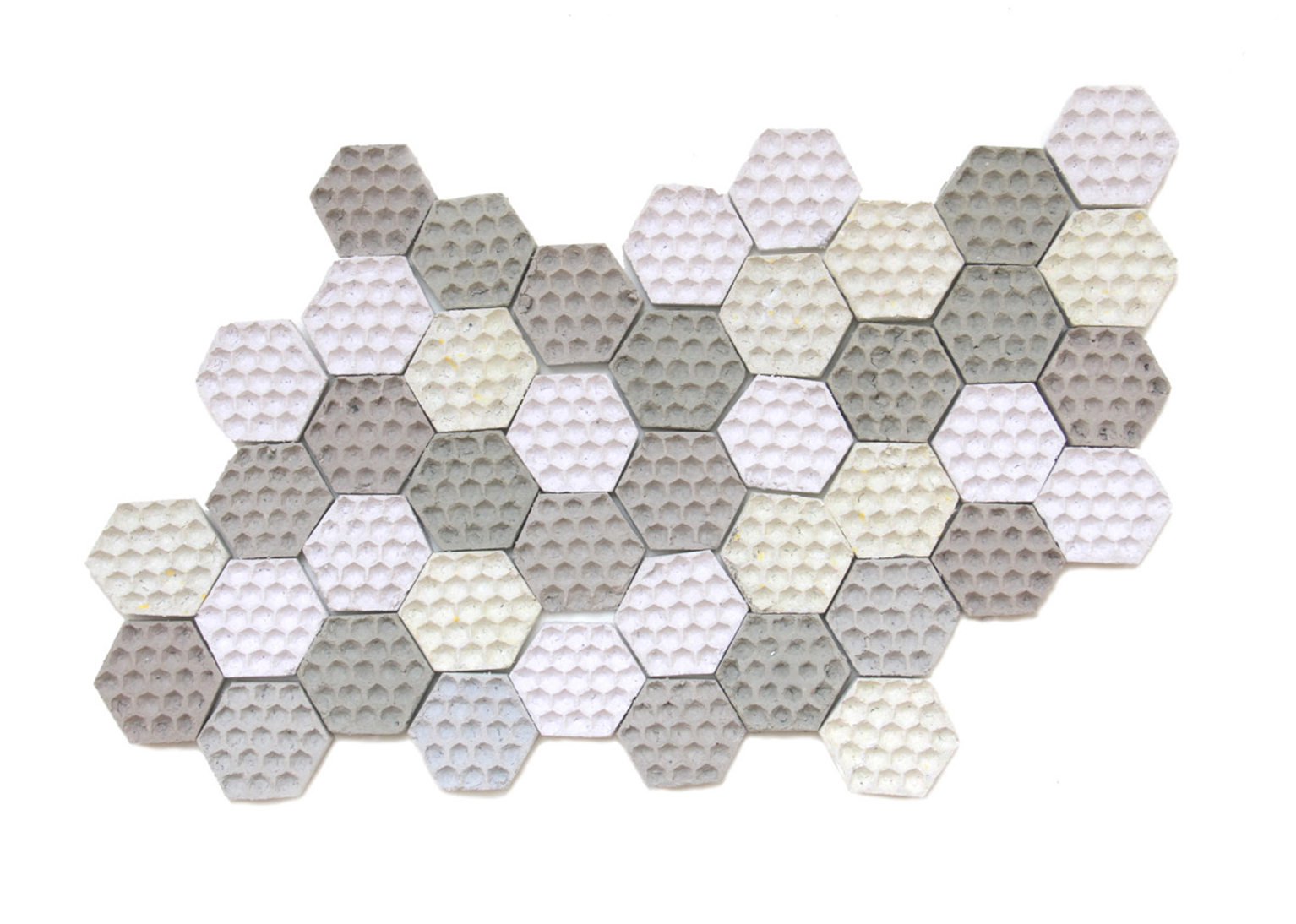 Ces dalles d’isolation phonique en cellulose ont été réalisées à partir d’éditions obsolètes (annuaires, encyclopédies, cartes …) amassées par Emmaüs. Elles doivent leur forme à un moule à gaufre, lui aussi déniché parmi les invendus de l’association. La simplicité du processus de fabrication (déchirer le papier, le plonger dans l’eau, mixer, mouler, presser puis sécher) permet de le réaliser sous forme d’atelier avec les compagnons et les clients afin de créer du lien et de les sensibiliser sur le cycle de vie des objets.